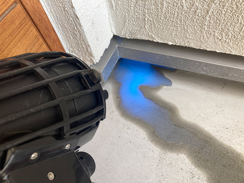 漏水箇所を確認します。ただし雨水の浸入箇所が複数箇所ある場合には、検査発光液を使用しないと浸入箇所の断定は難しくなります。